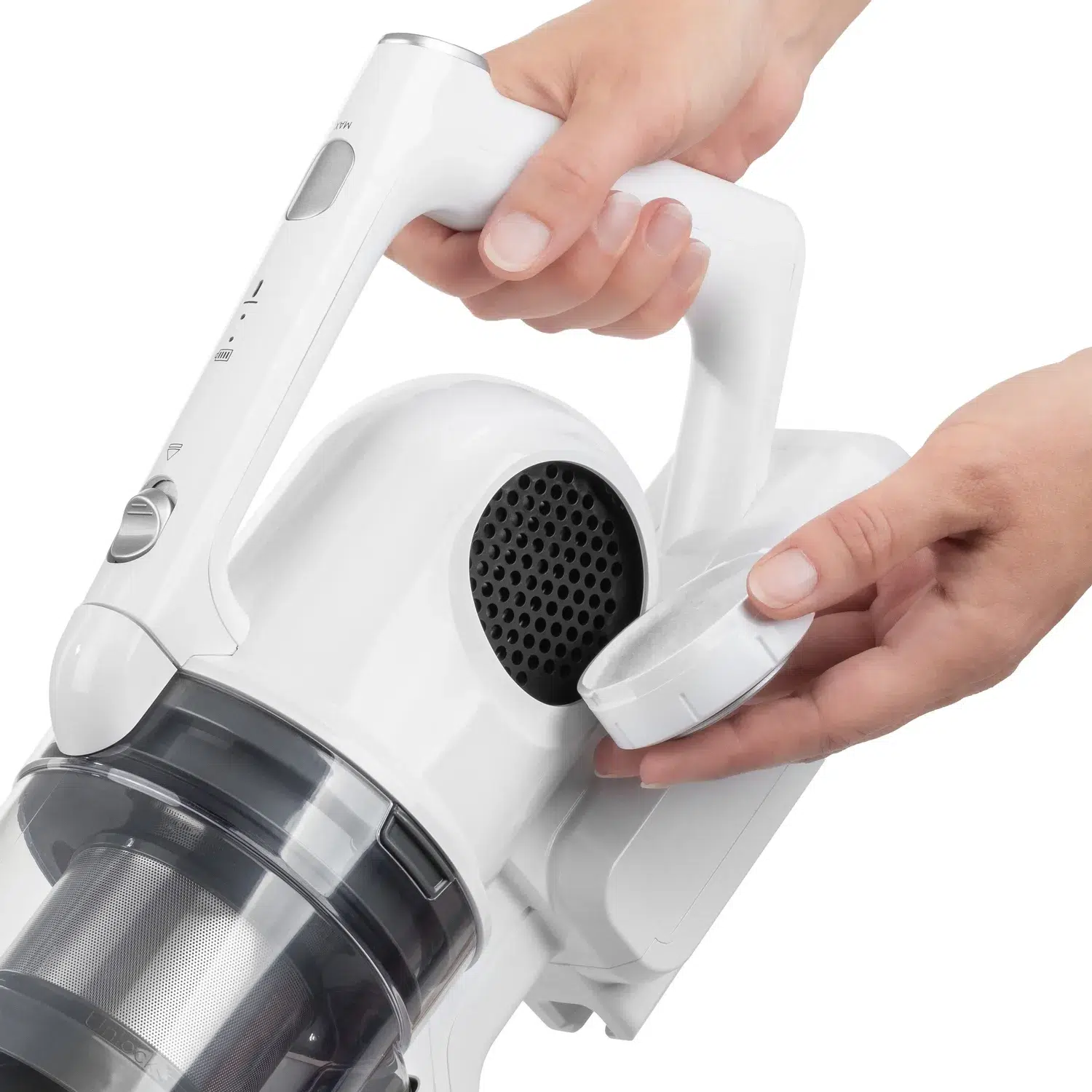 Den innovative cyklonfilterteknologi sikrer, at støvsugeren fungerer uden støvposer. Og fordi du ikke længere har brug for dyre støvposer, sparer du penge over enhedens lange levetid. Den store støvbeholder med en kapacitet på 650 ml tørt snavs kan tømmes hurtigt og let: Hold beholderen med åbningen nedad over en skraldespand, tryk på udløserknappen, og bundklappen åbnes automatisk. Du kommer hverken i kontakt med snavs eller er nødt til at række ud i snavs med din hånd. Den gennemsigtige plastbeholder kan let skylles ud med rent vand. Da HEPA-filteret ikke bør komme i kontakt med vand, kan du nemt fjerne det, inden du rengør opsamlingsbeholderen vådt.