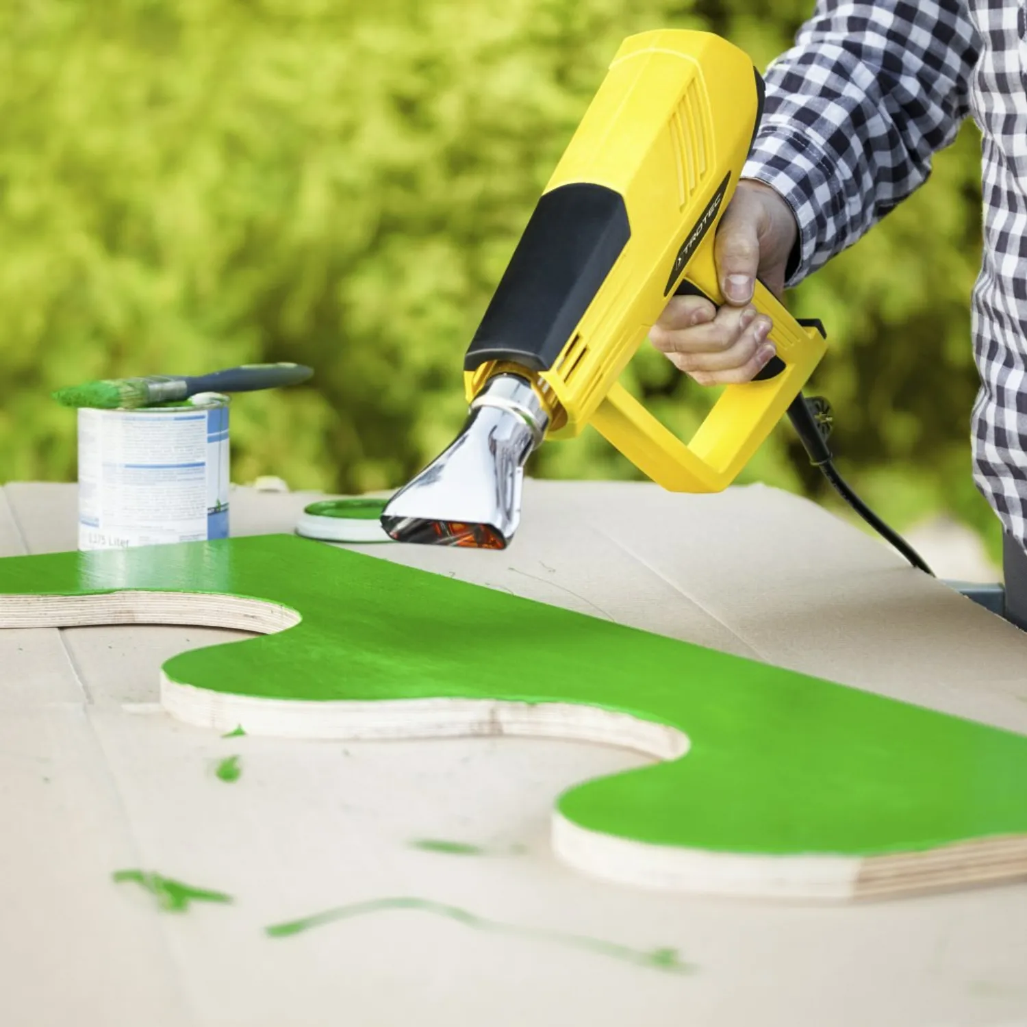 Og en bred stråledyse sikrer en kontinuerlig luftfordeling over et stort område, ideel til at fjerne gamle malingslag over store områder eller til jævn jævn tørring af spartelarbejde.