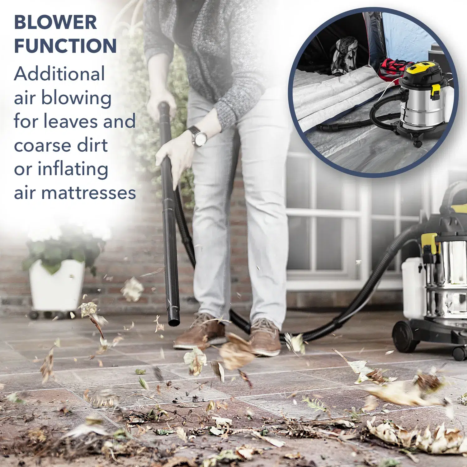 Det er ikke kun, når bladene falder om efteråret, at blæsefunktionen på VC 1200W ekstremt praktisk. Den kraftige luftydelse fra industristøvsuger er ideel til at blæse blade og groft snavs væk og groft snavs på terrassen og på udendørsarealer. Den kan også snavsede områder indendørs kan også let blæses ud.