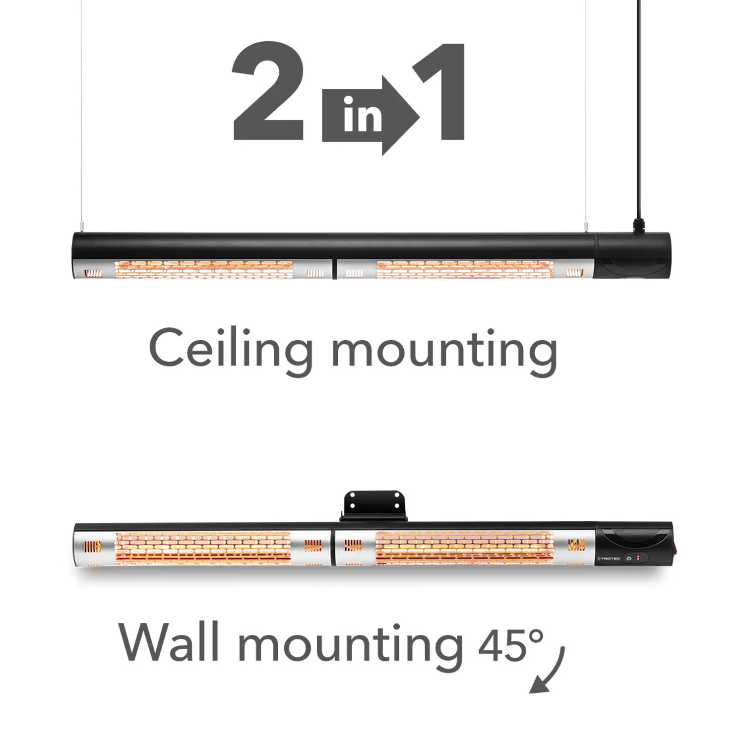 Den moderne IR 2200 med sit industrielle look er lige så fleksibel, når det gælder montering, som når det gælder anvendelsesmuligheder. Et dekorativt kabelsystem med hurtig skrueforbindelse er allerede inkluderet i leveringsomfanget til ukompliceret loftsmontering. Et vægbeslag, som også medfølger, gør det muligt at montere varmestråleren vandret eller lodret på væggen. Det 45° drejelige led på væg- eller loftsmonteringen gør det muligt at rette varmestrålerne præcist mod sidde- eller bordområder.