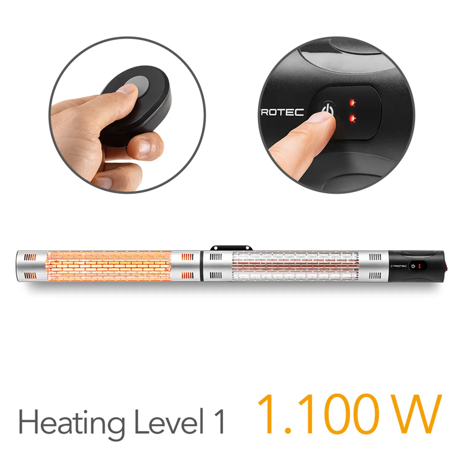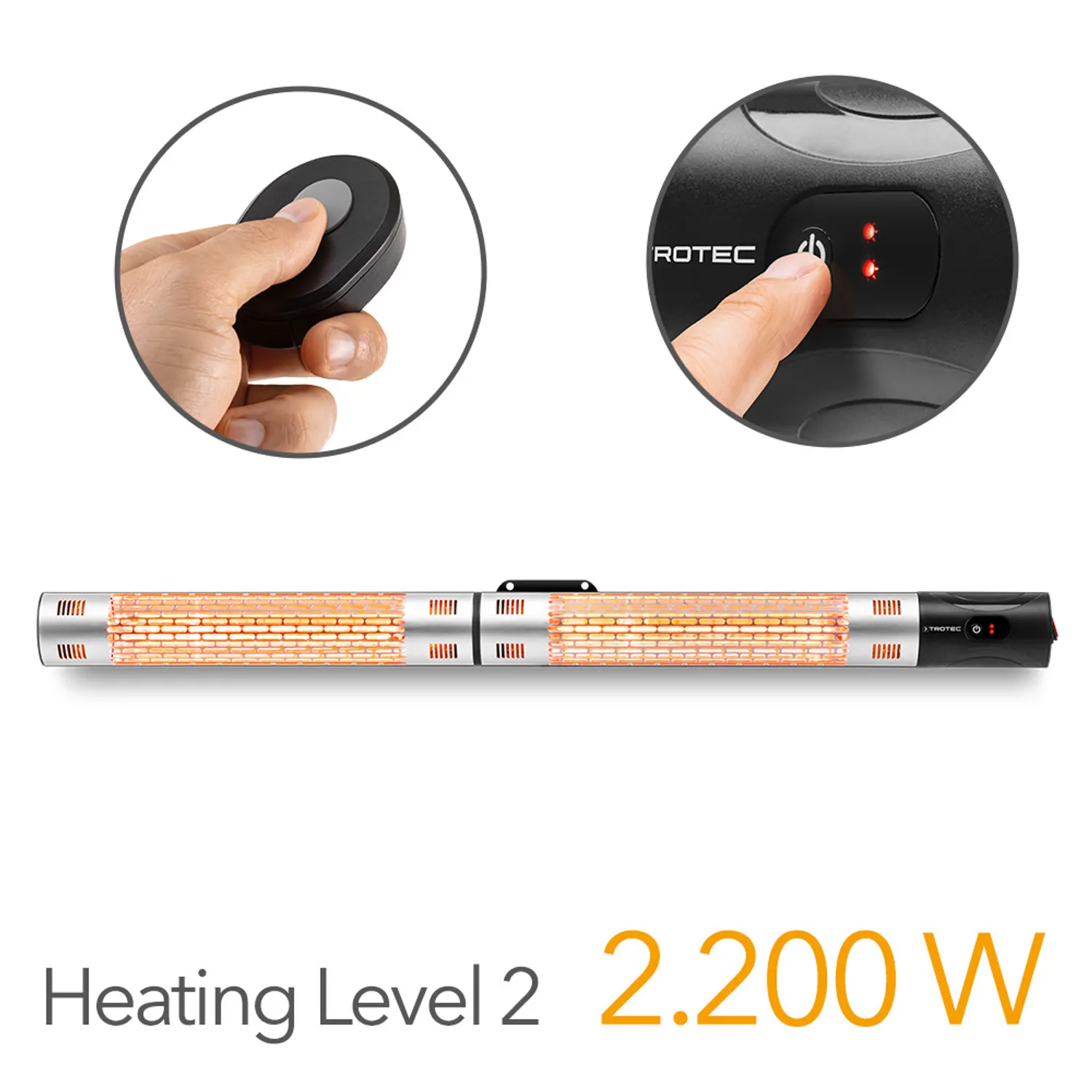 Den behagelige infrarøde varme fra den 1.039 mm lange varmestråler kan mærkes på huden, så snart den er tændt. For at justere varmeintensiteten har IR 2200 to varmeindstillinger på 1.100 watt og 2.200 watt, som kan vælges ved hjælp af den medfølgende fjernbetjening. For at sikre, at lyset fra varmestråleren ikke forstyrrer atmosfæren i omgivelserne, bruger IR 2200 et infrarødt rør med 80 procent mindre lys og den nyeste lavblændingsteknologi. Udpakning. Installation. Tænd. Føl dig godt tilpas.