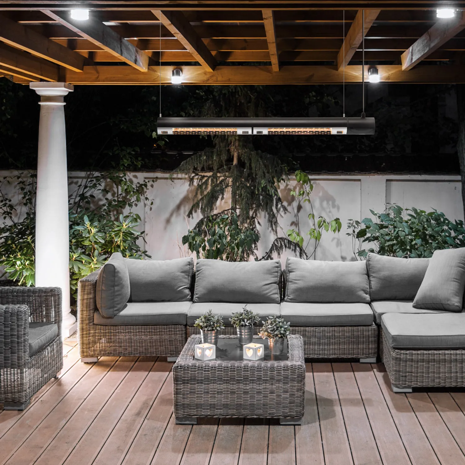 Forat du ikke skal blive overrasket, får du her et lille tip: Varmestrålere med lav blænding ser lige så intenst rødlige ud som konventionelle infrarøde varmestrålere uden lav blænding. Men de udsender faktisk 80 % mindre synligt lys. Med samme varmeeffekt – for mere hygge og romantik.